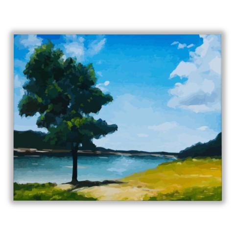 Táj - számfestő készlet – 40×50 cm (Keret nélkül) Ez a festmény egy nyugodt, idilli tájat ábrázol, amely békét és harmóniát sugároz a néző számára. A kép egy magányos fa árnyékában mesél el egy csendes történetet a természet szépségéről. A kék ég és zöld
