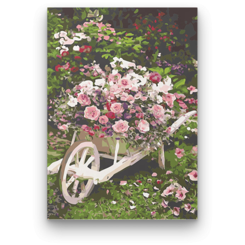 Talicska virágok - számfestő készlet – 40×50 cm (Keret nélkül) Ez a festmény egy békés, virágokkal teli kert nyugalmát árasztja, ahol az idő mintha megállt volna. Egy régi talicska mesél a múltról, miközben virágokkal teli pompájával vonzza a tekintetet.