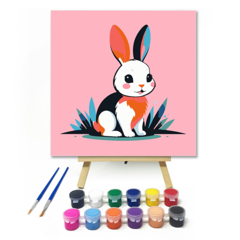 Tarka kisnyúl - gyerek számfestő készlet – 20×20 cm (Keret nélkül) Itt van egy bájos kisnyuszi, aki vidáman üldögél a színes réten, és már alig várja, hogy életre keltsd a festékek segítségével! A cukorka színek és a mosolygós nyuszi arca minden gyerek ke