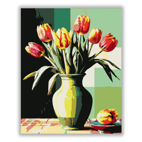Tavaszi harmónia - számfestő készlet – 40×50 cm (Keret nélkül) A tavasz üde színeivel ragyogó csendélet nyugalmat áraszt, miközben egy történetet mesél a természet szépségéről és az otthon melegségéről. A vibráló zöldek és pirosak kontrasztja életet lehel