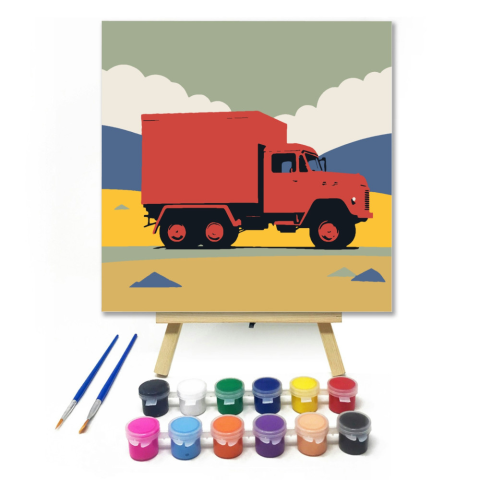 Teherautó az úton - gyerek számfestő készlet – 20×20 cm (Keret nélkül) Ez a kép egy vidám teherautót ábrázol, amint bátran gurul az úton a napos tájon. A színes festékek és a barátságos formák izgalmas kalandot ígérnek a kicsiknek. Tökéletes választás, ho