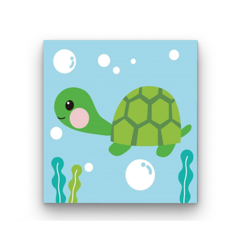 Teknős a Vízben - gyerek számfestő készlet – 20×20 cm (Keret nélkül) Ez a kép egy barátságos kis teknőst mutat, aki boldogan úszkál a vízben buborékok és vízi növények között. A vidám kék és zöld színek élénkítik a kép hangulatát. Tökéletes választás a gy