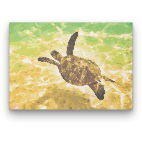 Teknős - számfestő készlet – 40×50 cm (Keret nélkül) A kép nyugodt, tengerparti hangulatot áraszt, amely a nézőt az óceán mélyére repíti. Egy magával ragadó történet bontakozik ki a víz alatt, ahol egy teknős békésen úszik a hullámok között. A zöld és ara