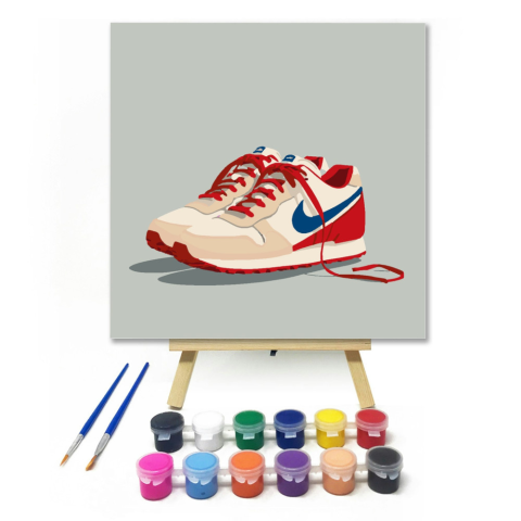 Tempós talpak - gyerek számfestő készlet – 20×20 cm (Keret nélkül) Ez a kép egy pár színes sportcipőt ábrázol, amik izgalmas kalandokra csábítanak! A piros és kék színek vidám hangulatot teremtenek, és csak arra várnak, hogy a kis festők életre keltsék ők