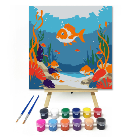 Tengeri barangolás - gyerek számfestő készlet – 20×20 cm (Keret nélkül) Ez a bájos kép egy vidám kis halacskát ábrázol, aki barátaival úszkál a tenger mélyén. A színes algák és korallok között igazi kaland vár rád! Tökéletes választás a gyerekek első teng