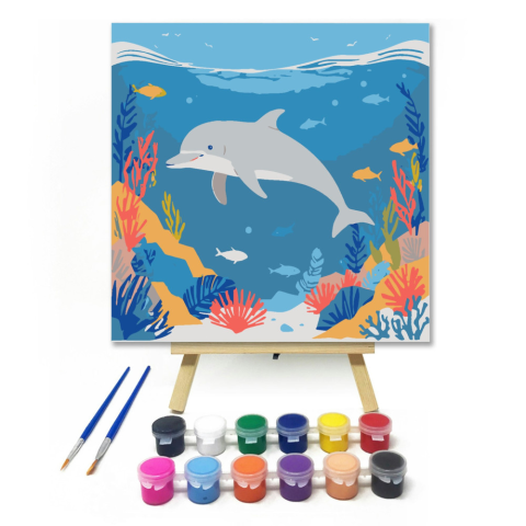 Tengeri kalandok - gyerek számfestő készlet – 20×20 cm (Keret nélkül) Ez a vidám kép egy játékos delfint ábrázol, aki barátságos halakkal úszkál a színes korallok között. A kék és narancs színek csodás tengeri világot teremtenek. Ideális választás minden