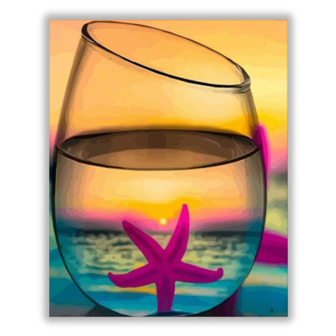 Tengericsillag - számfestő készlet – 40×50 cm (Keret nélkül) A festmény a naplemente varázslatos hangulatát idézi elő, ahol a tengericsillag finoman lebeg a pohárban. Egy romantikus történet bontakozik ki a háttérben, ahogy a nap utolsó sugarai elérik a v