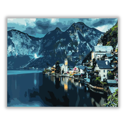 Tengerparti falu - számfestő készlet – 40×50 cm (Keret nélkül) A kép egy festői falut ábrázol a hegyek lágy ölelésében, ahol a tündöklő épületek tükröződnek a tenger vizében. A színek harmóniája, a zöldellő hegyek és a kékes égbolt találkozása varázslatos