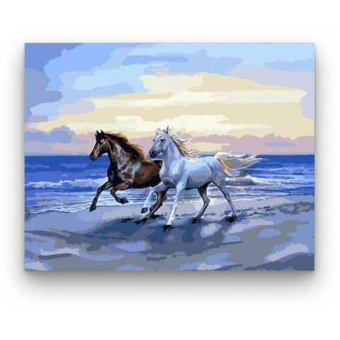 Tengerparti vágta - számfestő készlet – 40×50 cm (Keret nélkül) A kép a szabadság és a természet erejét sugározza, ahogy a lovak szinte repülnek a homokos tengerparton. A háttérben húzódó tenger és az égbolt találkozása egy végtelen utazás ígéretét hordoz