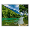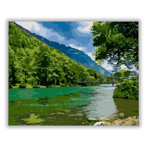 Természet - számfestő készlet – 40×50 cm (Keret nélkül) Ez a festmény nyugodt, békés hangulatot áraszt, mintha egy csendes vidéki tájba kalauzolna minket. A kép egy idilli folyóparti jelenetet ábrázol, ahol a természet és az ember alkotta világ harmonikus