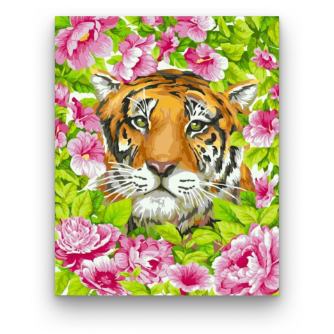 Tigris virágban - számfestő készlet – 40×50 cm (Keret nélkül) A festmény egy izgalmas kaland ígéretét hordozza magában, ahol a természet és a vadon találkozik. A tigris tekintete mélyen beleolvad a virágok buja kavalkádjába, mintha egy titkos kert őrzője