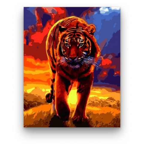 Tigris vörösben - számfestő készlet – 40×50 cm (Keret nélkül) A kép egy vad, mégis lenyűgözően elegáns atmoszférát áraszt. A tigris mintha egy mesebeli történet hőse lenne, aki épp kalandra indul a naplemente fényében. Az élénk vörösek és mély kékek kontr