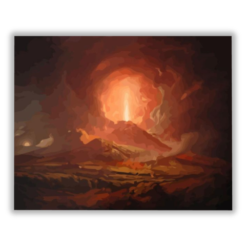 Tűzhányó - számfestő készlet – 40×50 cm (Keret nélkül) A festmény a természet vad erejét és drámai szépségét ábrázolja, amely azonnal magával ragadja a nézőt. Egy tűzhányó kitörésének pillanata bontakozik ki, mintha egy ősi történet elevenedne meg előttün