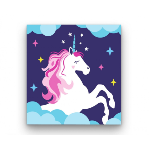 Unikornis a felhőben - gyerek számfestő készlet – 20×20 cm (Keret nélkül) Ez a kép egy varázslatos unikornist ábrázol, aki boldogan ugrándozik a puha felhők között, körülötte csillagok ragyognak. A kék és rózsaszín színek együttese mesebeli hangulatot ter