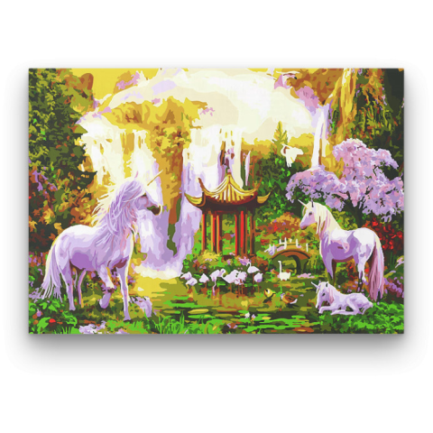 Unikornis Család 2 - számfestő készlet – 40×50 cm (Keret nélkül) Ez a festmény egy varázslatos világba repít, ahol a természet és a fantázia harmonikus egységet alkot. A kép mesés tájat ábrázol, ahol a béke és a nyugalom uralkodik. Az élénk színek és a ré
