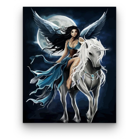 Unikornis hátán - számfestő készlet – 40×50 cm (Keret nélkül) A festmény misztikus hangulata az éjszaka csendjét és varázsát idézi meg. Egy titokzatos történet bontakozik ki, ahol az égbolt sötétje egy különleges utazást rejt. A kék és ezüst árnyalatok el