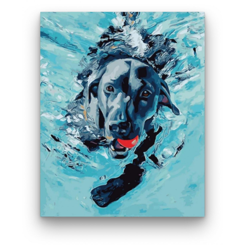 Úszó kutyus - számfestő készlet – 40×50 cm (Keret nélkül) A festmény a szabadság és az öröm érzését kelti, ahogy egy kutya boldogan úszik a vízben. A kép egy történetet mesél el a játékos pillanatról, amely tele van élettel és mozgással. A kék árnyalatok