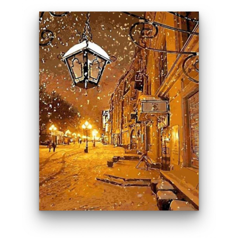 Utcai látkép hóesésben - számfestő készlet – 40×50 cm (Keret nélkül) Készíts gyönyörű műalkotásokat, előzetes festő tudás nélkül! Éld át az alkotás gyönyörű pillanatait és varázslatos hangulatát! Akkor is gyönyörű festményeket hozhatsz létre, ha még nem f