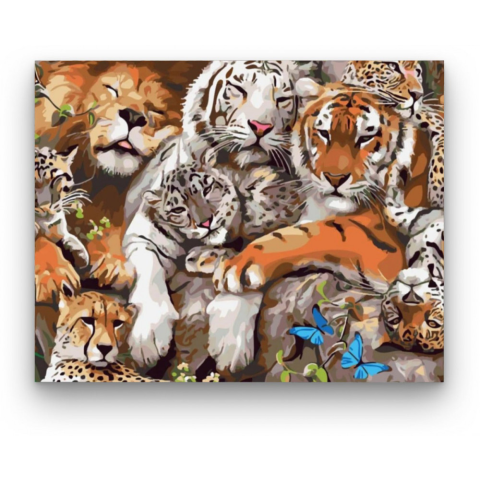 Vadállatok álma - számfestő készlet – 40×50 cm (Keret nélkül) Ez a festmény a vadállatok békés nyugalmát árasztja, mintha egy mesebeli világba csöppentünk volna. A képen megjelenő állatok közötti harmónia egy titokzatos történetet sejtet, amely a természe