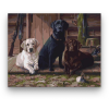 Vadászkutyák - számfestő készlet – 40×50 cm (Keret nélkül) A festmény nyugodt, mégis izgalmas hangulatot áraszt, ahogy három vadászkutya őrzi a vidéki ház verandáját. A kép története egy hűséges társaság pillanatát örökíti meg, ahol minden részlet a termé