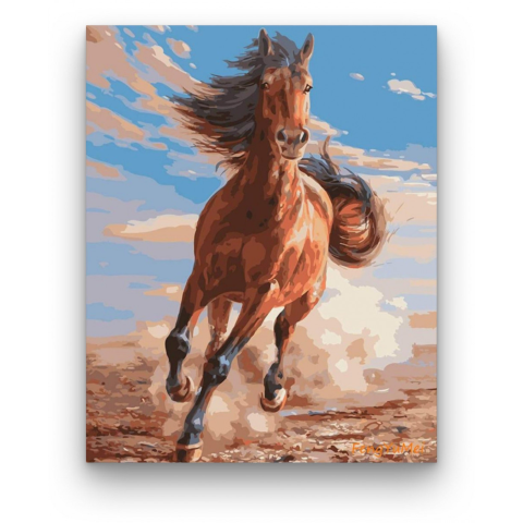 Vágtató barna ló - számfestő készlet – 40×50 cm (Keret nélkül) Ez a kép az erő és szabadság lenyűgöző megtestesülése, mely magával ragadja a nézőt. Egy történet bontakozik ki a szemünk előtt, ahol a természet hatalma és szépsége találkozik. A kék ég és a