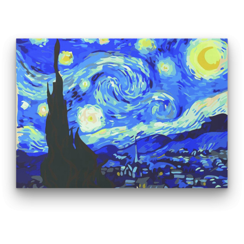 Van Gogh Csillagos Éj - számfestő készlet – 40×50 cm (Keret nélkül) A festmény éteri nyugalmat áraszt, mintha a néző egy álomszerű világba lépne be. A kavargó éjszakai égbolt történeteket mesél a csillagok és a hold táncáról. Az élénk kék és sárga árnyala