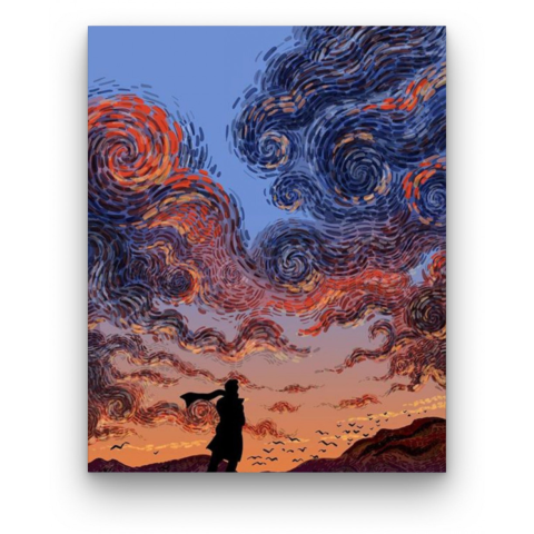 Van Gogh égbolt - számfestő készlet – 40×50 cm (Keret nélkül) A festmény varázslatos, álomszerű hangulatot áraszt, amely elragadja a nézőt egy másik világba. Egy magányos alak áll a szélben, mintha a természet titkait próbálná megérteni. A kavargó égbolt