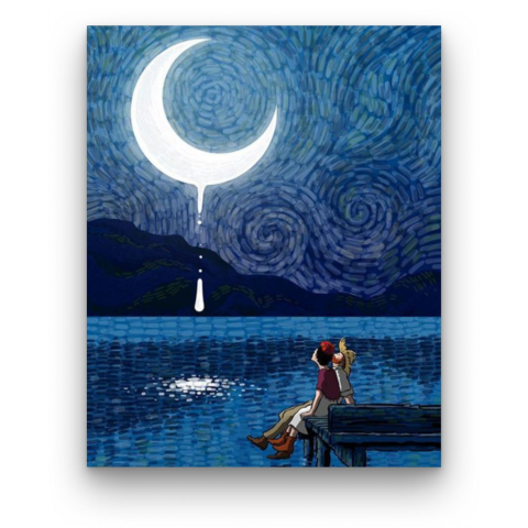Van Gogh estje - számfestő készlet – 40×50 cm (Keret nélkül) A festmény egy varázslatos éjszakai jelenetet tár elénk, ahol a holdfény titokzatos táncot jár a víz felszínén. Két alak ül csendben a mólón, mintha egy különleges történetet osztanának meg egym