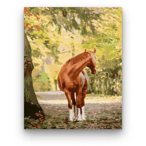 Várakozó paripa - számfestő készlet – 40×50 cm (Keret nélkül) A festmény meleg, őszi hangulatot áraszt, ahol a természet csendje és a paripa nyugalma találkozik. Egy magával ragadó történet bontakozik ki, ahol a ló szinte életre kel az árnyékos ösvényen.