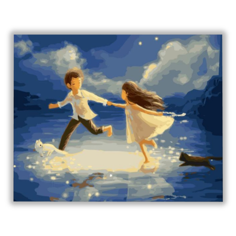 Varázslat - számfestő készlet – 40×50 cm (Keret nélkül) Ez a festmény varázslatos, álomszerű hangulatot áraszt, mintha egy mesebeli világba repítene minket. A kép központi alakjai között egy örömteli és szabad pillanat bontakozik ki, tele mozgással és éle