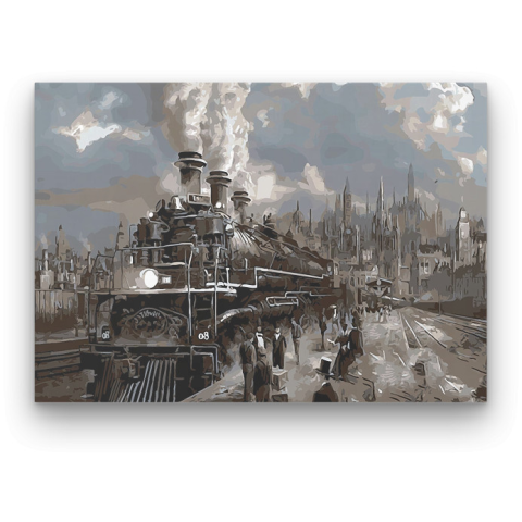 Városi Gőzmozdony - számfestő készlet – 40×50 cm (Keret nélkül) A festmény egy régi világba kalauzol, ahol a gőzmozdonyok dübörgése tölti be a várost. A kép egy izgalmas történetet mesél el, ahol a múlt és a jövő találkozik a vasúti sínek mentén. A szürké