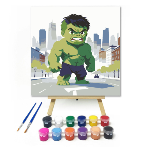 Városi zöld óriás - gyerek számfestő készlet – 20×20 cm (Keret nélkül) Ez a kép egy mókás zöld óriást ábrázol, aki vidáman sétál a városban. A színes épületek és a kék égbolt remek hátteret adnak ehhez a kalandhoz. Tökéletes választás a gyerekek kreatív