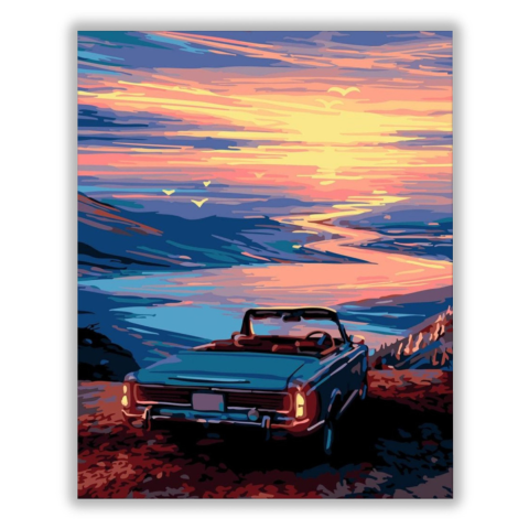 Végeláthatatlan - számfestő készlet – 40×50 cm (Keret nélkül) A festmény egy elbűvölő naplemente hangulatát idézi, amely nosztalgikus utazásra invitál. A magányos autó sziluettje a tájban egy elfeledett kaland történetét meséli el. A vibráló narancs és ké
