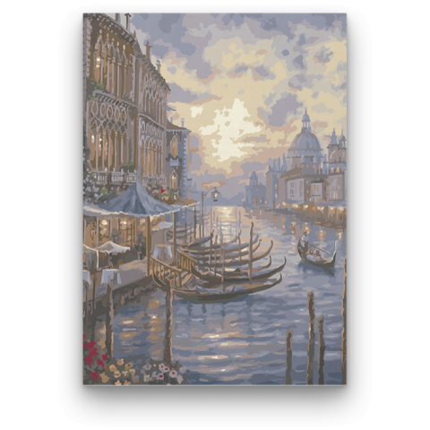 Velencei Gondolák - számfestő készlet – 40×50 cm (Keret nélkül) A festmény nyugodt, romantikus hangulatot áraszt, ahogy a naplemente fényei tükröződnek a vízen. A látvány magával ragadó történetet mesél egy városról, amely tele van élettel és rejtett titk
