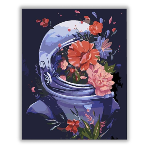 Virágba borult űrruha - számfestő készlet – 40×50 cm (Keret nélkül) A festmény egy varázslatos világba kalauzol, ahol a természet és az univerzum találkozik. Az űrruha virágokkal való benépesítése egy különleges történetet mesél el az élet és a felfedezés