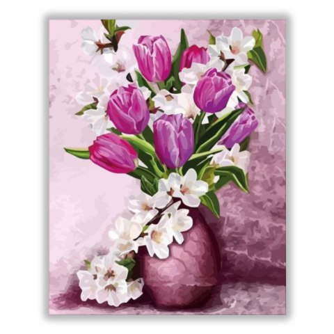Virágszálak - számfestő készlet – 40×50 cm (Keret nélkül) Ez a festmény egy tavaszi virágcsokor üde és friss hangulatát idézi, amely az otthon melegét árasztja. A kompozíció szinte mesél egy titokzatos kert történetéről, ahol minden szín életre kel. A róz