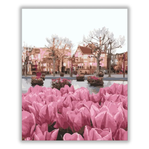 Virágzás - számfestő készlet – 40×50 cm (Keret nélkül) A festmény nyugodt, romantikus hangulatot áraszt, amely a tavasz ígéretét hordozza magában. Egy városi táj elevenedik meg, ahol a virágok szinte mesélik a történetüket. A rózsaszín árnyalatok és a lág