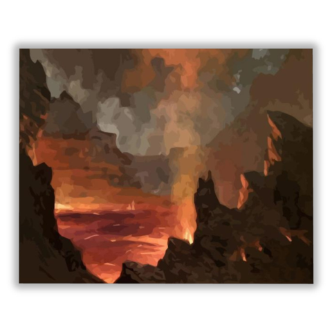 Vulkán belseje - számfestő készlet – 40×50 cm (Keret nélkül) A kép egy lenyűgöző, izzó vulkáni tájat ábrázol, amely egyszerre kelt félelmet és csodálatot. A mély, földöntúli színek és a kavargó füst mesélnek egy történetet a természet nyers erejéről. Az é