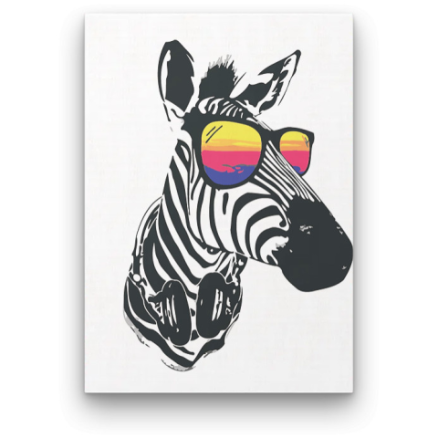 Zebra Napszemüvegben - számfestő készlet – 40×50 cm (Keret nélkül) Ez a kép egy vidám, modern hangulatot áraszt, mely azonnal mosolyt csal az arcodra. A zebra napszemüvegben mesélni kezd egy nyári kalandról a szavannán, ahol a naplemente színei tükröződne