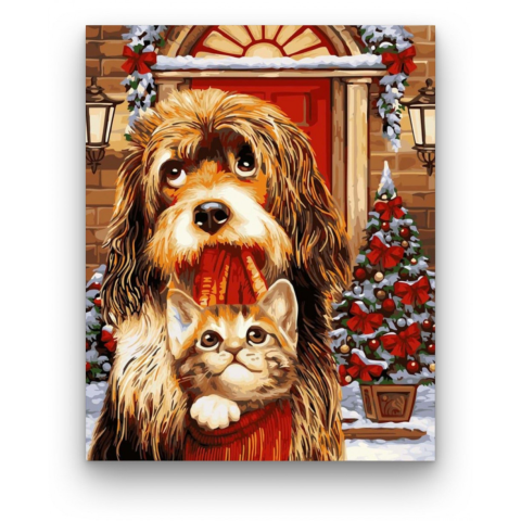 Zsákba macska - számfestő készlet – 40×50 cm (Keret nélkül) A kép melegséget és meghittséget sugároz, mintha a tél varázsa egy pillanatra megállt volna. Egy kutya és egy cica bájos pillanata, ami mesébe illő történetet sejtet. A piros és zöld színek kontr