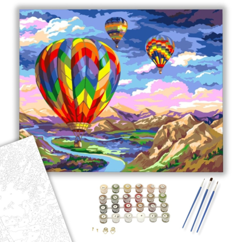 A fellegekben - számfestő készlet – 40×50 cm (Keretre feszítve) A festmény élénk színei az égbe emelnek, mintha a szabadság könnyedségét éreznénk. Egy történet bontakozik ki előttünk, ahol a léggömbök színes álmai a távoli hegyek fölé repítenek. A vibráló