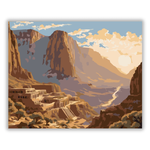 A Királyok Völgye Napkeltekor - számfestő készlet – 40×50 cm (Keret nélkül) A festmény a Királyok Völgyének lenyűgöző látványát ábrázolja napkeltekor, ahol a nap sugarai megvilágítják a sziklás sziklafalakat és az ősi sírok bejáratát. A kompozíció meleg,