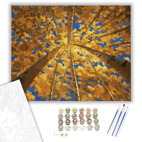 A nyárfák alatt - számfestő készlet – 40×50 cm (Keretre feszítve) A festmény meleg, őszi hangulatot áraszt, amely az elmúlás szépségét ünnepli. Egy történet bontakozik ki a természet csendes nyugalmáról és az idő múlásáról. Az arany és barna árnyalatok ha