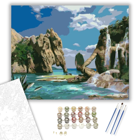 A természet kincse - számfestő készlet – 40×50 cm (Keretre feszítve) A festmény varázslatos tájat tár elénk, ahol a természet és az emberi alakok harmóniában olvadnak össze. Egy rejtélyes történet bontakozik ki, mintha az ősi sziklák mesélnének a múltról.