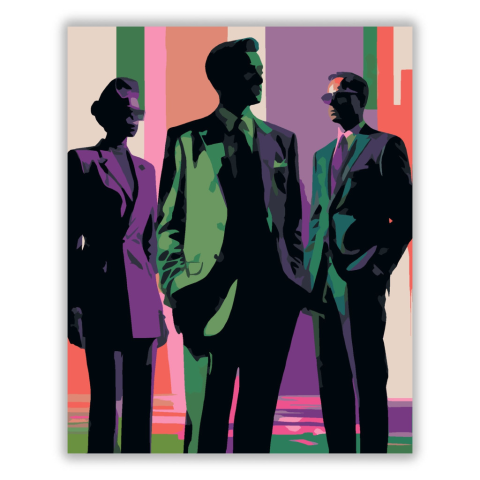 Absztrakt Árnyalatok Sziluettjei - számfestő készlet – 40×50 cm (Keret nélkül) A kép egymásra rétegzett emberi sziluetteket ábrázol, különböző árnyalatokkal és ecsetvonás textúrákkal. A színpaletta lila, smaragdzöld, fekete és neon rózsaszín árnyalatokból