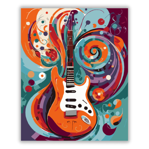Absztrakt Gitár és Zenei Hullámok - számfestő készlet – 40×50 cm (Keret nélkül) A festmény egy absztrakt gitárt ábrázol, amelyet dinamikus zenei motívumok vesznek körül, mint például hangjegyek és hullámzó formák. A színpaletta élénk, tangerin, aqua, skar
