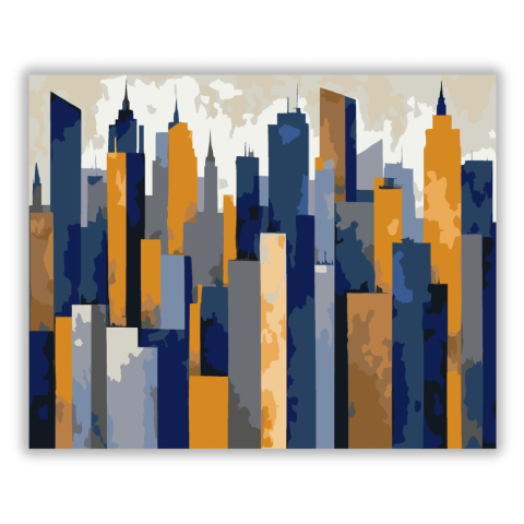 Absztrakt Városi Sziluett - számfestő készlet – 40×50 cm (Keret nélkül) A festmény egy stilizált városi sziluettet ábrázol, ahol a város formái függőleges ritmusban jelennek meg. A domináns sötétkék, aranysárga és szürke árnyalatok erőteljes, mégis harmon