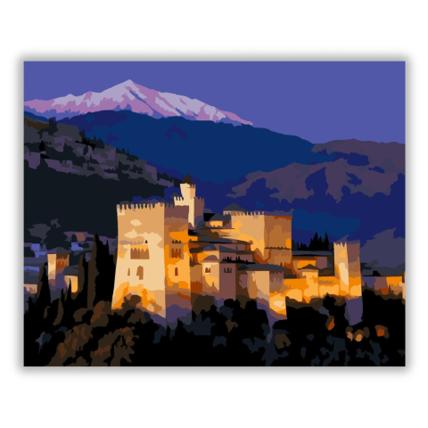 Alhambra Granada Délutáni Fényekben - számfestő készlet – 40×50 cm (Keret nélkül) A festmény Granadában az Alhambrát ábrázolja, ahogy a mór építészet meleg fényei ragyognak a szürkületben. A háttérben a Sierra Nevada hegység magasodik, kiegészítve a jelen