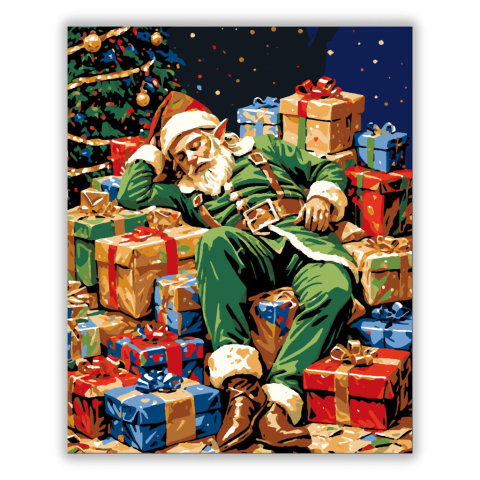 Álmodozó Manó Pihenése - számfestő készlet – 40×50 cm (Keret nélkül) A kép egy fáradt manót ábrázol, aki békésen szunnyad az ajándékhalom ölelésében. A háttérben egy csillogó karácsonyfa áll, aranyszínű fényekbe burkolózva, míg az égbolton csillagok szórj