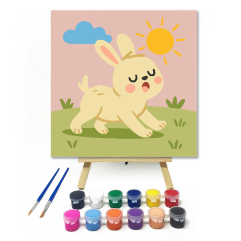 Álmos Nyuszi a Réten - gyerek számfestő készlet – 20×20 cm (Keret nélkül) A kép egy álmos kis nyuszit ábrázol, aki a napsütötte réten ásít. A meleg színek és a barátságos jelenet vidám hangulatot árasztanak. Tökéletes választás a gyerekek első festési kal